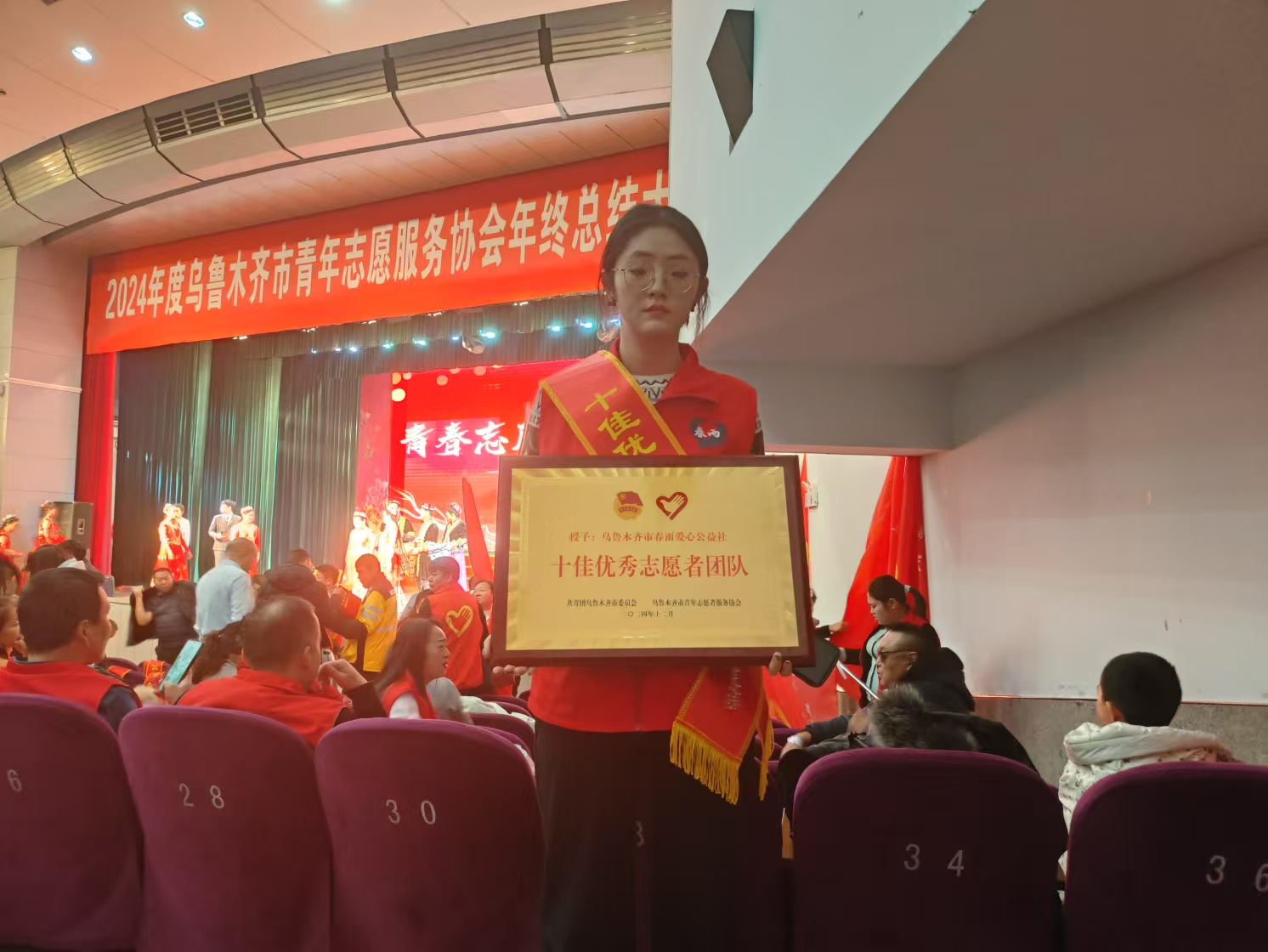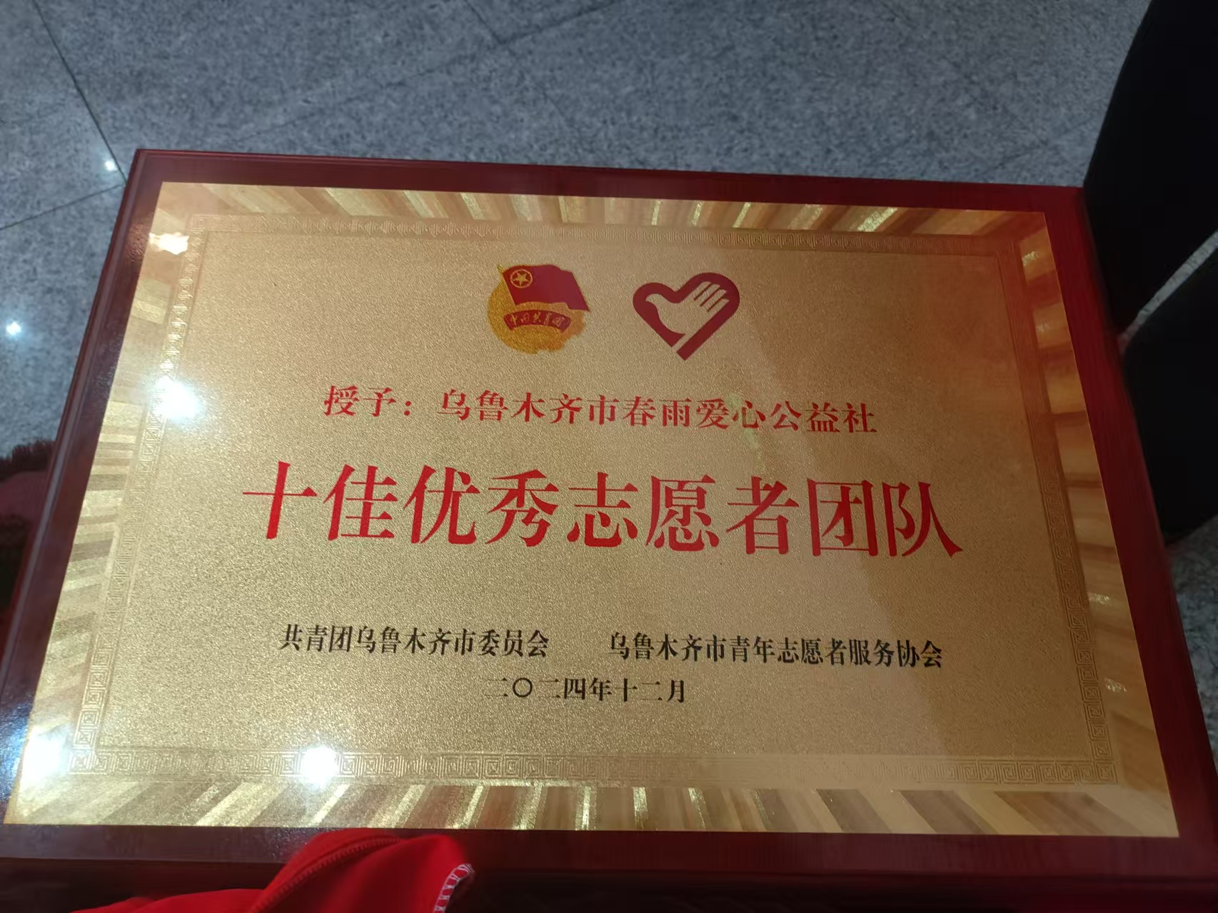 本网讯:2025年1月12日下午,在乌鲁木齐市青年志愿者协会举办的年度评选活动中,春雨爱心公益社凭借其卓越的志愿服务表现和突出的社会贡献,荣获“十佳优秀团队”称号。
